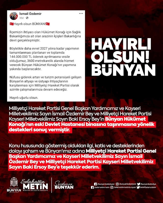Bünyan Belediye Başkanı Selahattin Metin ise; "Milliyetçi Hareket Partisi Genel Başkan Yardımcımız ve Kayseri Milletvekilimiz İsmail Özdemir ve Milliyetçi Hareket Partisi Kayseri Milletvekilimiz Baki Ersoy’un Bünyan Hükümet Konağı’nın eski devlet hastanesi binasına taşınmasına yönelik destekleri sonuç vermiştir. Konu hususunda göstermiş oldukları ilgi, katkı ve desteklerinden dolayı şahsım ve Bünyan’ımız adına Milliyetçi Hareket Partisi Genel Başkan Yardımcımız ve Kayseri Milletvekilimiz İsmail Özdemir ve Milliyetçi Hareket Partisi Kayseri Milletvekilimiz Baki Ersoy’a teşekkür ederim" dedi.