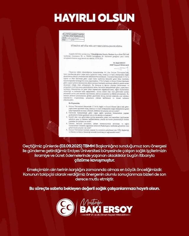Milliyetçi Hareket Partisi (MHP) Kayseri Milletvekili Baki Ersoy, Erciyes Üniversitesi’nde (ERÜ) görev yapan sağlık personellerinin ikramiye ve ücret ödemelerindeki sorunların çözüme kavuşturulduğunu duyurdu.
