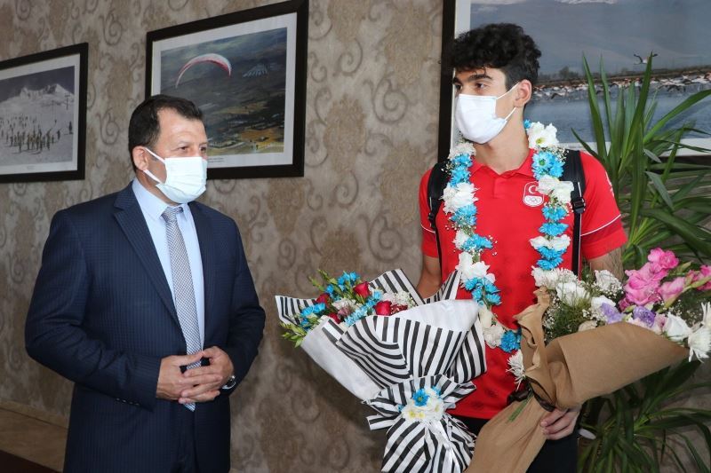 Milli yüzücü Yiğit Aslan çiçeklerle karşılandı