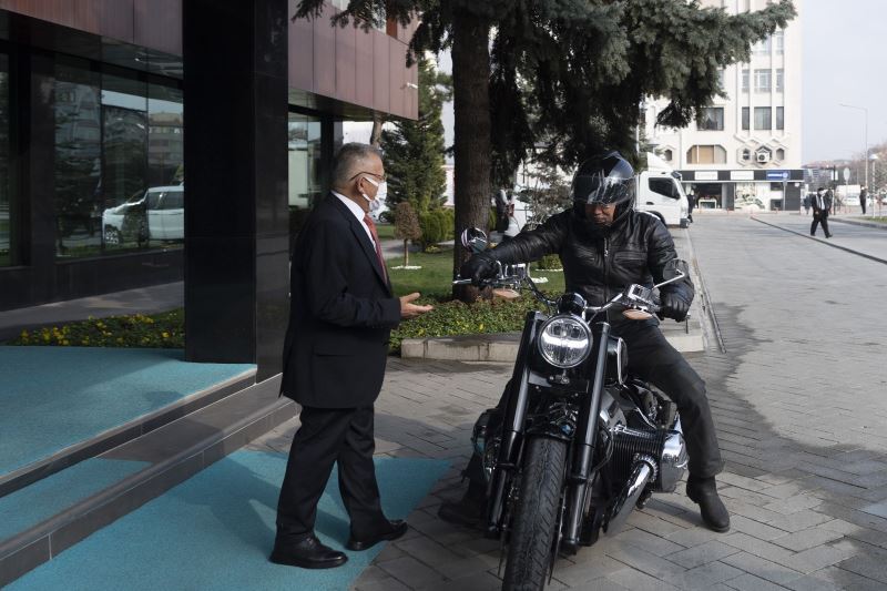 Motosiklet tutkunu Kürşat Tüzmen Başkan Büyükkılıç’ı ziyarete motosikletiyle geldi