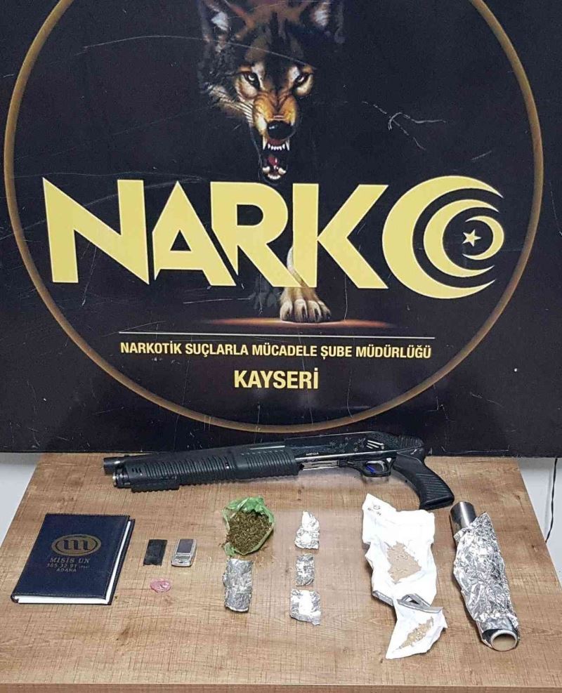 Edinilen bilgiye göre, Kayseri İl Emniyet Müdürlüğü Narkotik Şube Müdürlüğü ekipleri, uyuşturucu madde ticareti yapıldığı tespit edilen adrese operasyon düzenledi. Evde yapılan aramada, satışa hazır 3 parça halinde 1.48 gram metamfetamin, 12.83 gram bonzai, 12.15 gram eroin, 1 adet hassas terazi, 1 adet uyuşturucu paketlemek için rulo folyo ve 1 adet pompalı tabir edilen tüfek ele geçirildi.