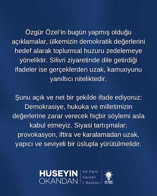 AK Parti Kayseri İl Başkanı Hüseyin Okandan, Cumhuriyet Halk Partisi (CHP) Genel Başkanı Özgür Özel’in Silivri ziyareti sırasında yaptığı açıklamaların toplumsal huzuru zedelemeye yönelik olduğunu söyledi.