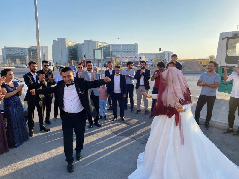 Kayseri Şehir Hastanesi’nde çalışan ve dünyaevine giren sağlıkçı çift, düğün salonundan önce çalıştıkları hastanenin önüne gelerek oynadı.