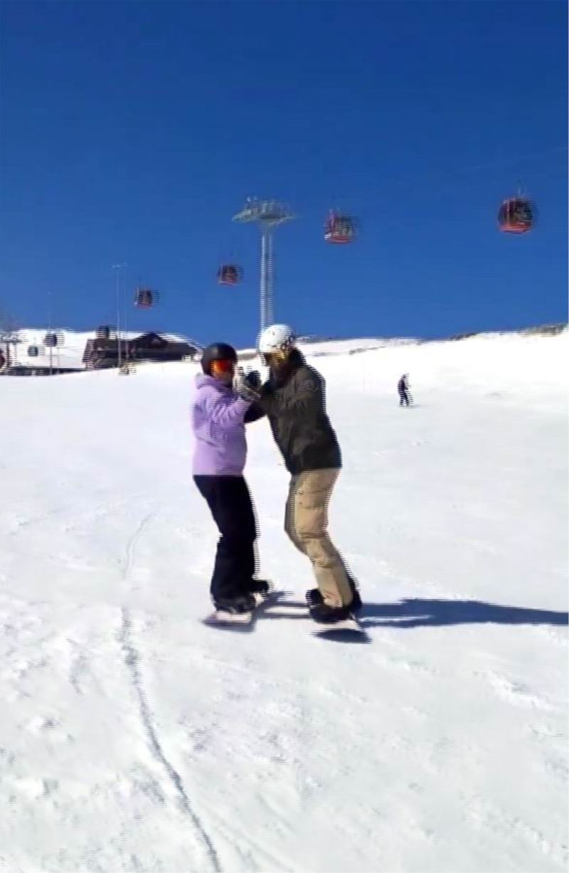Türkiye’nin en önemli kış turizm merkezlerinden Erciyes Kayak Merkezi’nde kayak yaparak dans eden çift, görenlerin ilgi odağı oldu.