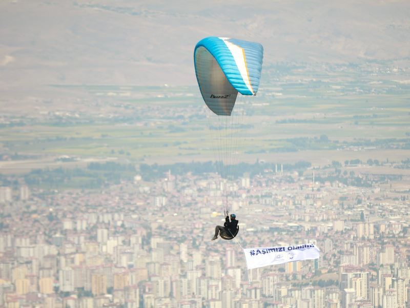 Bu yıl 12.si düzenlenen Ali Dağı Yamaç Paraşütü Mesafe Yarışması devam ederken iki paraşütçünün taşıdığı pankartla aşı kampanyasına dikkat çekildi.