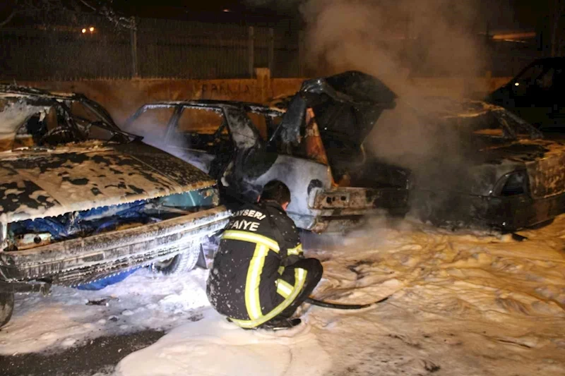 Kayseri’nin Kocasinan ilçesinde bulunan Yeni Sanayi’de park halindeki hasarlı araçlarda yangın çıktı. Çıkan yangında 3 araç hasar gördü.