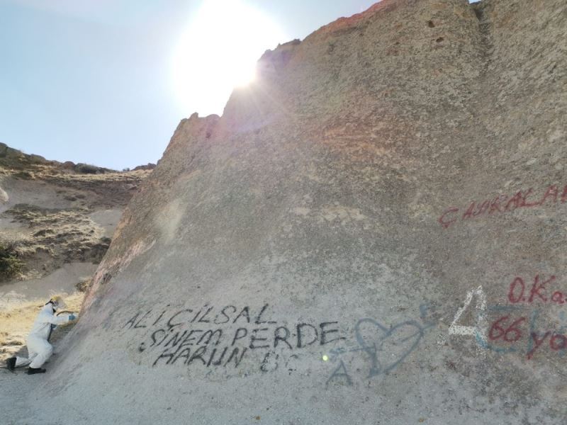 Kayseri’nin Yeşilhisar ilçesinde bulunan peribacalarına kimliği belirsiz kişilerce yazılan yazıların temizlenme işlemi başladı.