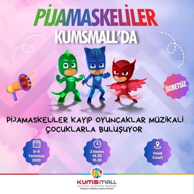 Pijamaskeliler Kayıp Oyuncaklar Müzikali KUMSMALL AVM’ye geliyor. Pijamaskeliler 8-9 Temmuz tarihlerinde çocuklarla buluşacak.