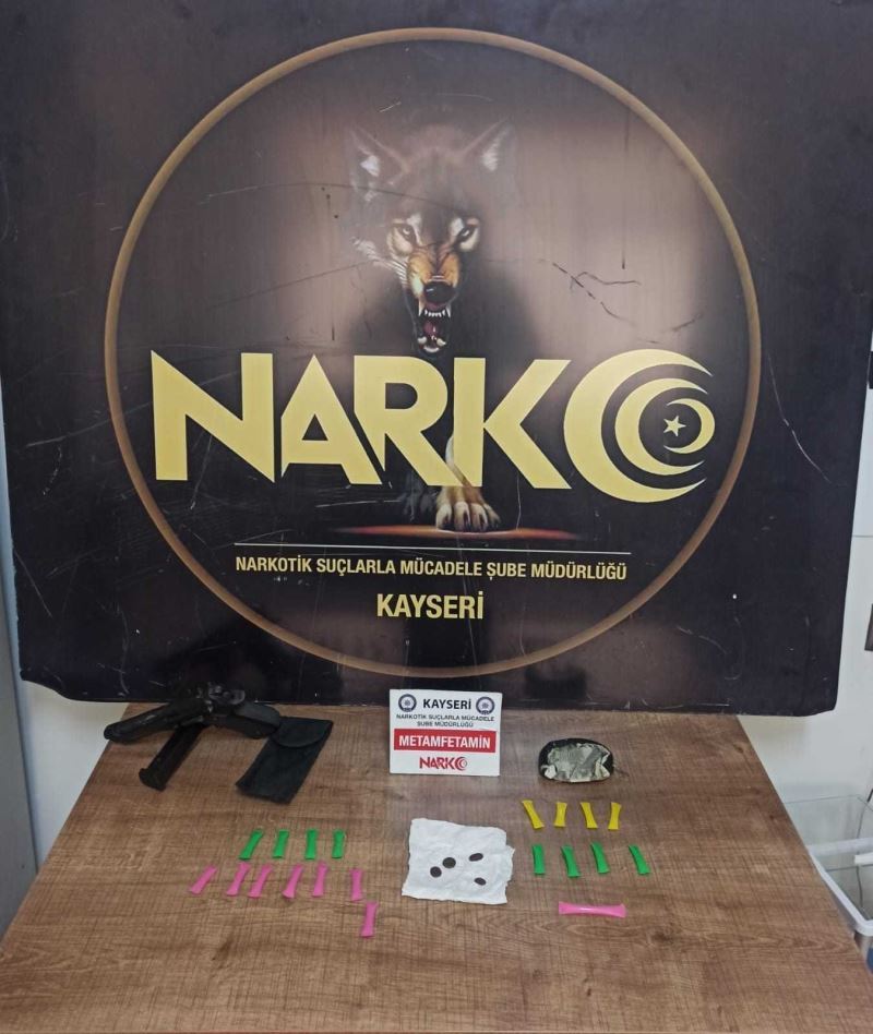 Edinilen bilgiye göre, Kayseri İl Emniyet Müdürlüğü Narkotik Şube Müdürlüğü ekipleri, uyuşturucu madde ticareti yapan şahıslara yönelik 2 ay süreli takipli çalışma sonucunda R.H., A.K. ve M.S.’nin kaldığı eve operasyon düzenledi. Evde yapılan aramada pipet içine özel yapılmış 23 fişek halinde satışa hazır 10.20 gram metamfetamin, 4 adet uyuşturucu paketlemek için kesilmiş folyo, 1 adet tabanca ile şarjörü ve 5607 sayılı kanun maddesi kapsamında olduğu değerlendirilen 4 adet sikke ele geçirildi. Şüpheliler R.H. ve M.S. yakalanırken, A.K.’yi yakalamak için çalışmalar sürüyor.