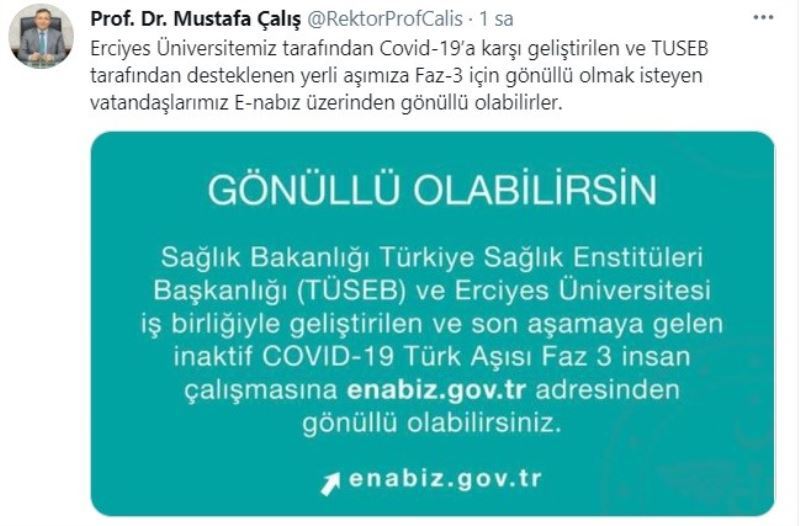 Erciyes Üniversitesi REktörü Prof. Dr Mustafa Çalış, sosyal medya hesabından yaptığı duyuruda, "Erciyes Üniversitemiz tarafından Covid-19’a karşı geliştirilen ve TUSEB tarafından desteklenen yerli aşımıza Faz-3 için gönüllü olmak isteyen vatandaşlarımız E-nabız üzerinden gönüllü olabilirler" ifadesinde bulundu.