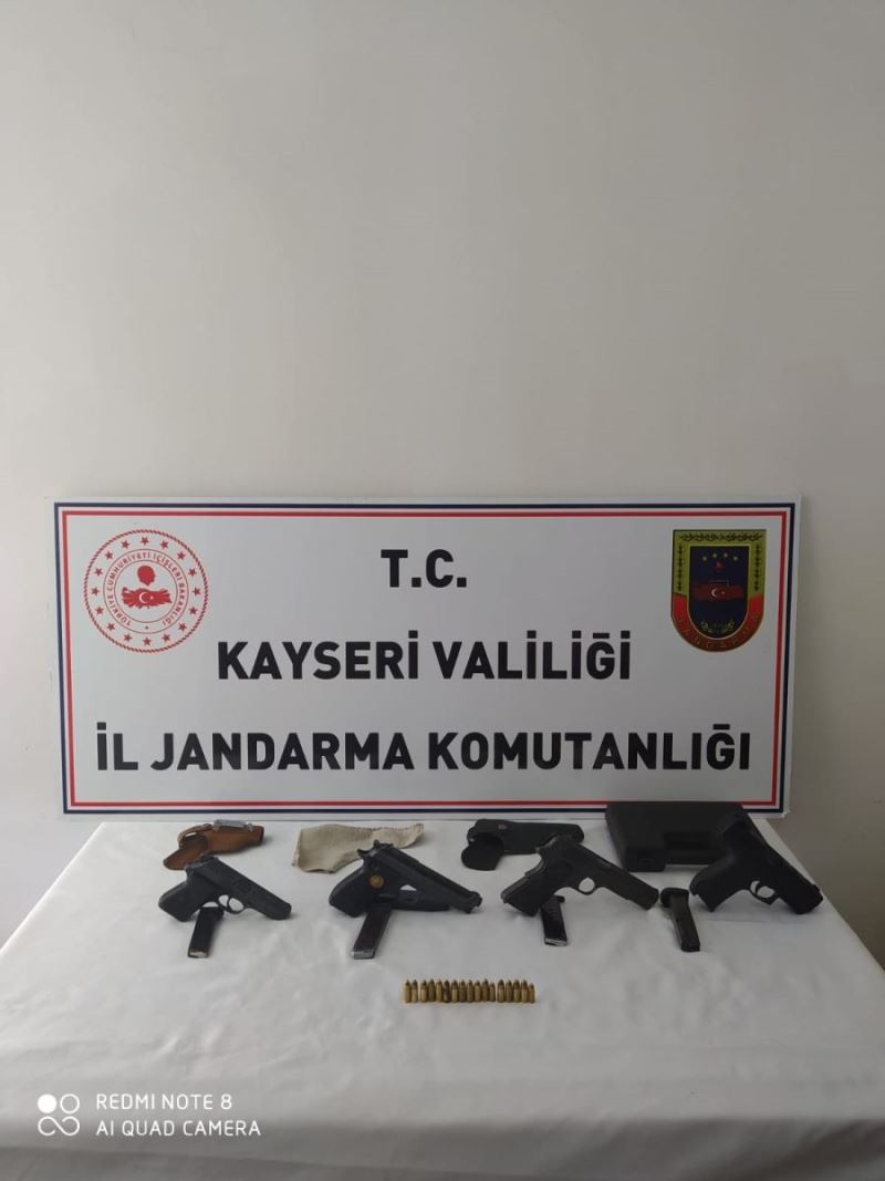 Kayseri İl Jandarma Komutanlığı tarafından yürütülen asayiş faaliyetleri kapsamında; Yeşilhisar ilçesi Kayadibi Mahallesinde bulunan N.E. ve H.E.’nin ikametlerinde ruhsatsız tabanca bulundurdukları ve silahları piyasaya sürmeye çalıştıkları bilgisinin elde edilmesi üzerine operasyon düzenlendi. Operasyonda yapılan aramada 3 adet ruhsatız tabanca ve 1 adet kurusıkı tabanca ele geçirildi. Olayla ilgili olarak N.E. ve H.E. de silah kaçakçılığı yapmak suçundan gözaltına alındı.