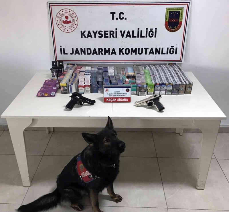 Kayseri İl Jandarma Komutanlığı KOM Şube Müdürlüğü, JASAT ve Melikgazi Gesi Jandarma Karakol Komutanlığı ekipleri tarafından kaçak/sahte alkol ve bandrolsüz sigara satışı yapan şahıslara yönelik istihbari çalışma başlatıldı. Yapılan çalışmalarda A.G.’nin ikamet ve iş yerinde kaçak/sahte alkol ve bandrolsüz sigara satışı yaptığı bilgisi üzerine tütün tespit köpeği Yolcu ile birlikte arama yapan ekipler, çeşitli markalara ait 745 paket kaçak bandrolsüz sigara ve 2 adet ruhsatsız tabanca buldu.