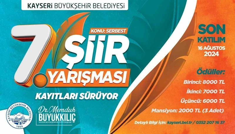 Kayseri Büyükşehir Belediyesi tarafından her yıl düzenlenerek geleneksel hale getirilen ve bu yıl da edebiyatseverlerden yoğun ilgi gören şiir yarışmasının 7’ncisi için kayıtlar sürüyor. Büyükşehir, 7’nci Şiir Yarışması’nda toplam 27 bin TL ödül dağıtacak.