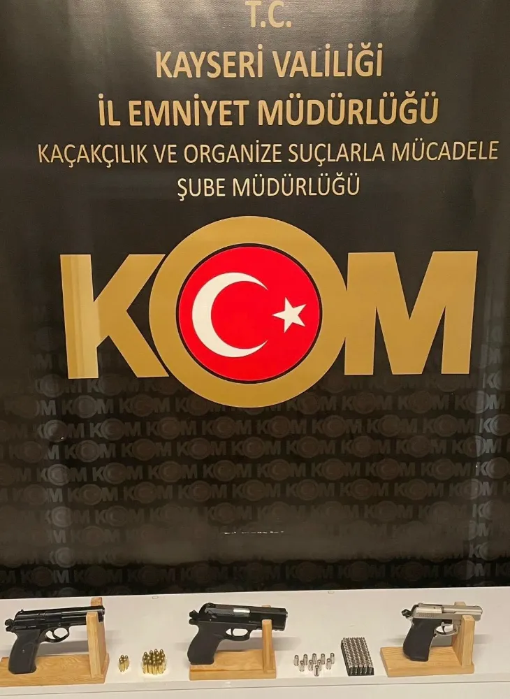Kayseri İl Emniyet Müdürlüğü Kaçakçılık ve Organize Suçlarla Mücadele Şube Müdürlüğü ekipleri tarafından kentte silah ticareti yapan şahısların yakalanmasına yönelik operasyon düzenlendi. Yapılan operasyonda H.T. (43) yakalanırken, yapılan aramalarda da 3 adet ruhsatsız tabanca, şarjör ve 82 adet fişek bulundu.