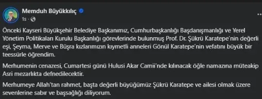 Başsağlığı mesajı yayımlayan Kayseri Büyükşehir Belediye Başkanı Memduh Büyükkılıç; "Önceki Kayseri Büyükşehir Belediye Başkanımız, Cumhurbaşkanlığı Başdanışmanlığı ve Yerel Yönetim Politikaları Kurulu Başkanlığı görevlerinde bulunmuş Prof. Dr. Şükrü Karatepe’nin değerli eşi, Şeyma, Merve ve Büşra kızlarımızın kıymetli anneleri Gönül Karatepe’nin vefatını büyük bir teessürle öğrendim. Merhumenin cenazesi, Cumartesi günü Hulusi Akar Camii’nde kılınacak öğle namazına müteakip Asri mezarlıkta defnedilecektir. Merhumeye Allah’tan rahmet, başta değerli büyüğümüz Şükrü Karatepe ve ailesi olmak üzere sevenlerine sabır ve başsağlığı diliyorum" ifadelerini kullandı.