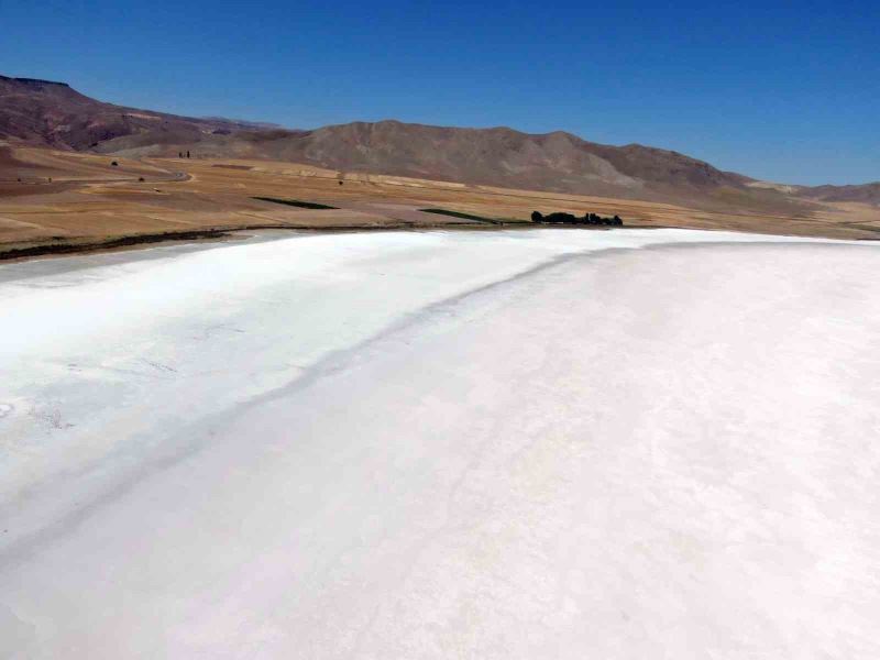 Kayseri’de bulunan Palas Tuzla Gölü’nde sıcak havaların etkisiyle gölün büyük bir bölümünde su buharlaşırken, geriye tuz kaldı. Bozkırın ortasında kalan beyaz gölde, görsel şölen oluştu.