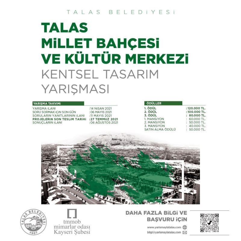 Talas Belediyesi tarafından İl Jandarma Komutanlığı içindeki 100 bin metrekarelik alana yapılacak Millet Bahçesi, düzenlenen fikir yarışmasıyla belirlenecek. Türkiye’de ilk kez bir Millet Bahçesi projesi için düzenlenen yarışmaya başvurular başladı.