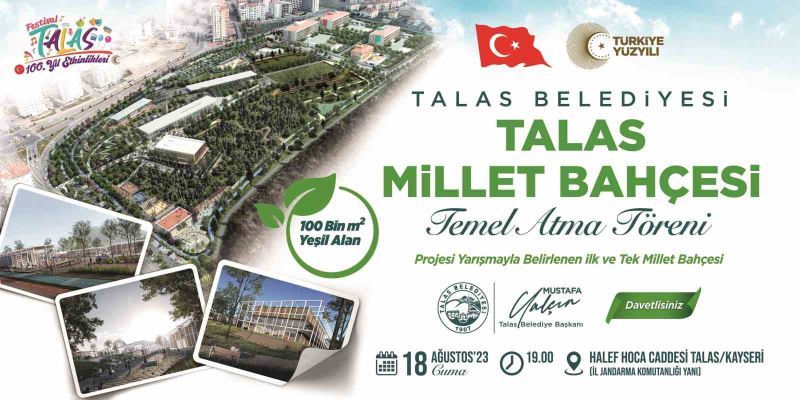 Projesi yarışmayla belirlenerek yaptırılacak ilk ve tek millet bahçesi olan Talas Millet Bahçesi’nin temeli 18 Ağustos Cuma günü saat 19.00’da düzenlenecek törenle atılacak.