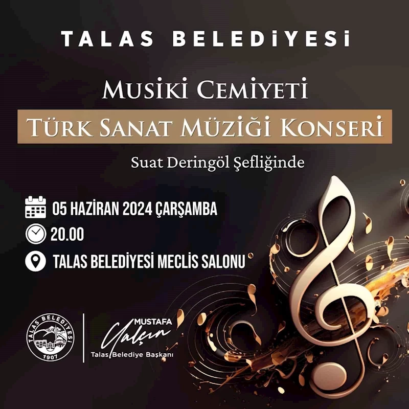 Daha önce verdiği konserlerle dikkat çeken Talas Musiki Cemiyeti yine bir konserle müzikseverlerin karşısına çıkacak. Şef Suat Deringöl yönetimindeki koro, 5 Haziran 2024 Çarşamba günü saat 20.00’de Türk Sanat Müziği severlere doyulmaz bir gece yaşatacak.