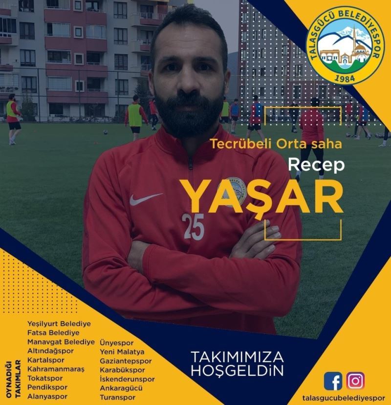 Talasgücü Belediyespor Kulübünden yapılan açıklamada, “Geçtiğimiz sezon 3.lig ekiplerinden Malatya Yeşilyurt Belediyespor forması giyen Recep Yaşar ile takımımız anlaşma sağladı. Tecrübeli oyuncumuza ve takımımıza hayırlı olsun” denildi.