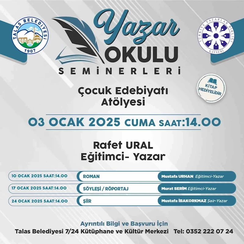 Ocak ayı boyunca yapılacak Yazar Okulu Seminerleri, Talas Belediyesi’nin diğer tüm programlarında olduğu gibi ücretsiz olarak gerçekleştirilecek. Programlarla ilgili 0352 222 0724 numaralı telefondan detaylı bilgi alınabilir.