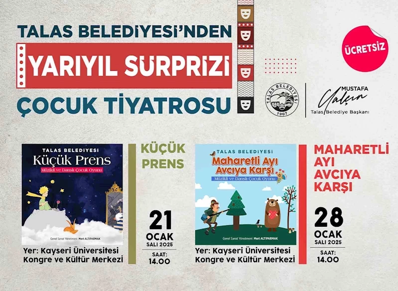 Çocuklara ve gençlere yönelik projeleriyle dikkat çeken Talas Belediyesi bunlara bir yenisini daha ekledi. Çocuklara okulların kapandığı yarıyıl tatilinde dinlenmesi ve eğlenmesi için farklı bir program düzenleyen belediyede ilk olarak Küçük Prens müzikli ve danslı çocuk oyunu gösterimi olacak. 21 Ocak 2025 Salı günü gerçekleşecek tiyatro oyunu saat 14.00’te başlayacak.