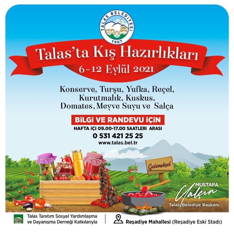 Talas Belediyesi tarafından ’Talas’ta Kış Hazırlıkları’ adı altında düzenlenen kışlık yiyeceklerin hazırlanmasını içeren organizasyon, bu yıl 06-12 Eylül tarihleri arasında gerçekleştirilecek.