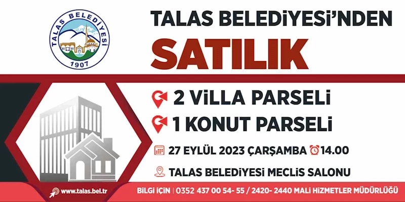 Mülkiyeti Talas Belediyesi’ne ait 2 villa parseli ve 1 konut parselinden oluşan taşınmazlar, düzenlenecek ihale ile satışa sunulacak. Satışlardan elde edilecek gelir, Talas Belediyesi’nin yeni yatırım ve hizmetlerinde kullanılacak.