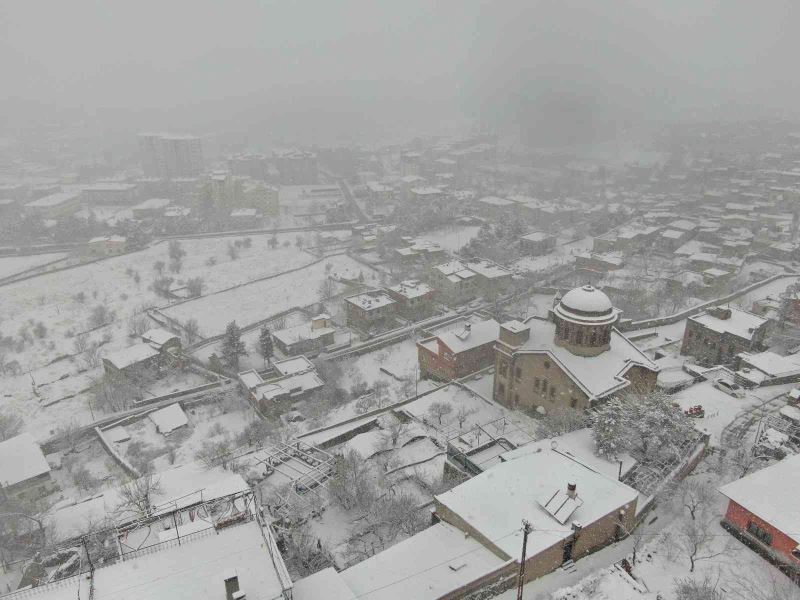 Dün gece saatlerinden itibaren etkisini sürdüren kar yağışı, kentte görsel şölen oluşturdu. Eski yapıların bol miktarda bulunduğu Talas ilçesi de beyaza bürünürken, kartpostallık görüntülere de sahne oldu. Kilise, konak, eski taş evleri bünyesinde bulunduran Yukarı Talas bölgesi ve Ali Saip Paşa Caddesi dron ile havadan görüntülendi.