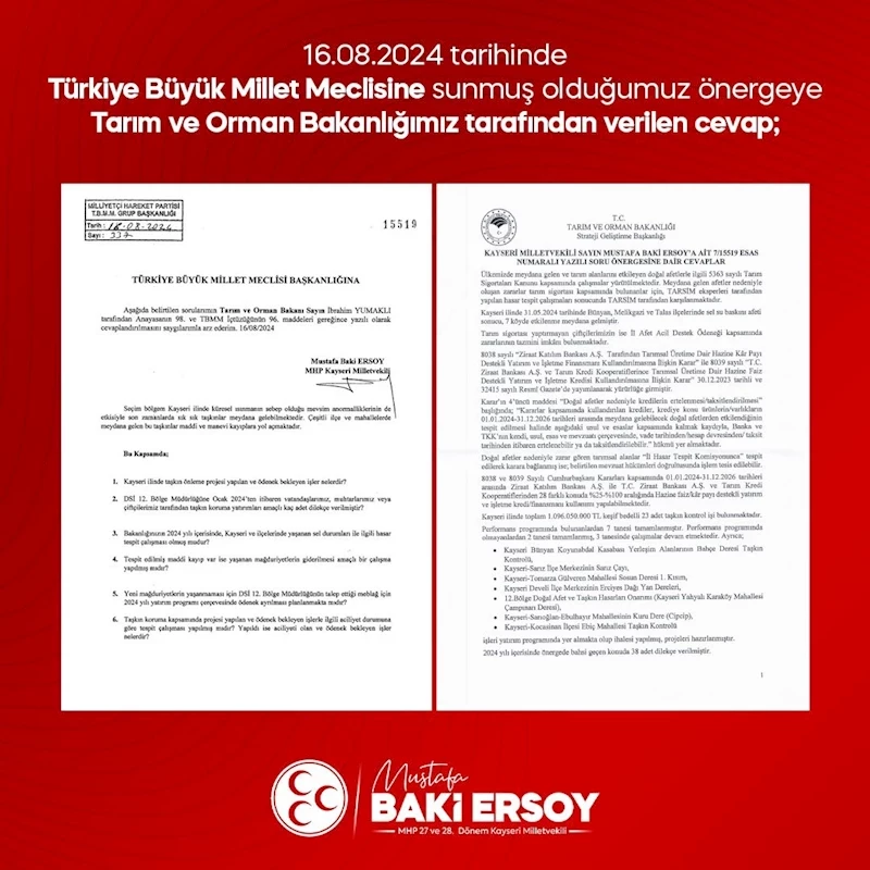 Milliyetçi Hareket Partisi (MHP) Kayseri Milletvekili Baki Ersoy’un Tarım ve Orman Bakanlığı’na 27 Ağustos tarihinde gönderdiği önergesine bakanlıktan cevap geldi.