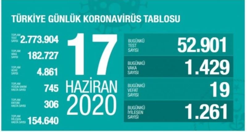 Sağlık Bakanlığından yapılan açıklamaya göre, son 24 saatte 19 kişi korona virüsten hayatını kaybetti, toplam can kaybı ise 4 bin 861'e yükseldi. Bugün toplam 52 bin 901 test yapılırken, bin 429 yeni vaka tanısı konuldu, toplam vaka sayısı ise 182 bin 727 oldu. Bugünkü bin 261 kişiyle birlikte toplam iyileşen sayısı da 154 bin 640'e yükseldi. Toplam entübe hasta sayısının 306, toplam yoğun bakım hasta sayısının ise 745 olduğu açıklandı.