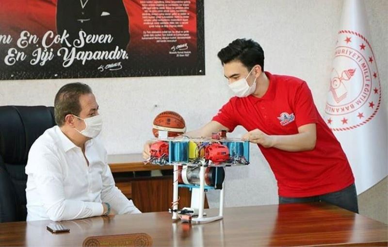Yarışmada Kayseri’yi başarı ile temsil eden Sümer Fen Lisesi ekibi, insansız ava aracı projesi hakkında İl Milli Eğitim Müdürü Celalettin Ekinci’ye bilgi verdi. (İHA) -