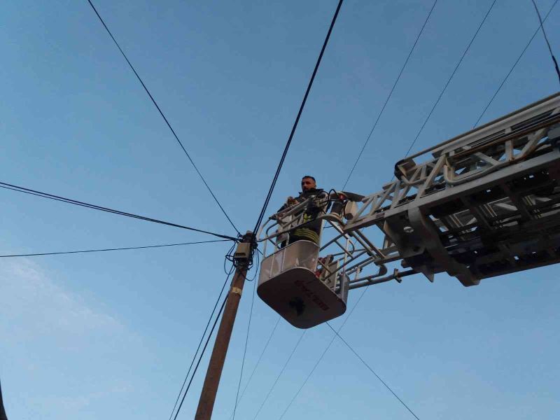 Telefon direğinde mahsur kalan kedinin yardımına itfaiye ekipleri koştu