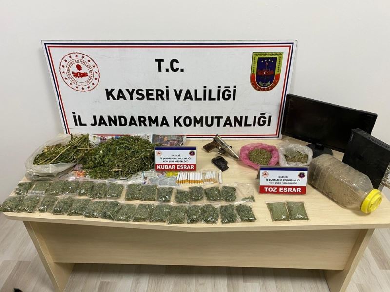 Edinilen bilgiye göre Tomarza ilçesinde jandarma ekipleri tarafından yapılan operasyonda 761 gram kubar esrar, 53 gram toz esrar, 1.293 gram kenevir tohumu, bir adet kuru sıkı tabanca, bir adet foto kapan, bir adet kayıt cihazı ve bir adet ekran ele geçirildi.