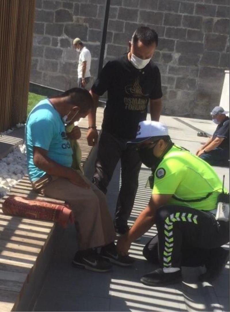 Kayseri'de bir trafik polisi, Cuma namazı çıkışında engelli bir vatandaşın ayakkabısını giymesine yardımcı oldu ve bağcıklarını bağladı.