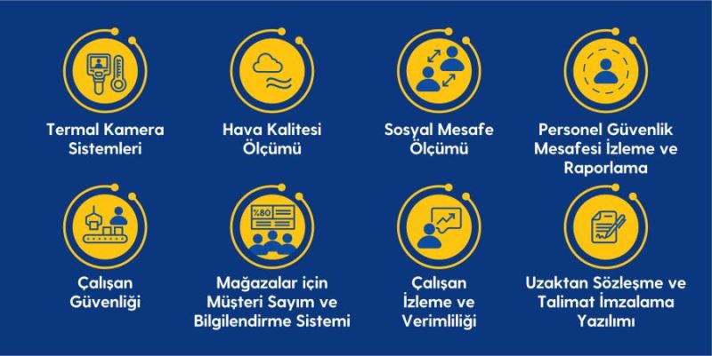 Ateşi yüksek personel veya müşterinin hızla tespitini yaparak müdahale etmek isteyen işletmeler için geliştirilen Termal İnsan Sıcaklığı Ölçüm çözümü, 30 ms içerisinde ateşi yüksek olan kişiyi belirliyor. Bu sayede sistem otomatik olarak birden fazla kişiyi eş zamanlı olarak tarıyor ve şüpheli kişi algılayınca sesli ve görsel uyarı çıkarıyor. Bununla birlikte Hava Kalitesi İzleme ve Uyarı Sistemi ile işletmeler anlık ortam değerlerini takip edebiliyor. Öte yandan Sosyal Mesafe Ölçümü çözümüyle de çalışanların ya da ziyaretçilerin gün içinde nerede olduğu ve kimlere temas ettiği belirlenerek anlık uyarılar gerçekleştiriliyor. Çalışma sahası içerisindeki iş güvenliği ve görev alanı kontrolünü güçlendirmek isteyen işverenler ise Personel Güvenlik Mesafesi İzleme ve Raporlama Platformu ile tüm ortam ve nesneleri gerçek zamanlı olarak izleyebiliyor, yönetebiliyor. Gerekli görülen noktalarda ise anlık uyarı sistemi ile kontrol ve müdahale imkanı bulunuyor.