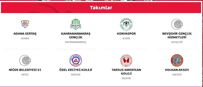 U18 Bölge Şampiyonaları Kırmızı Grup ve Beyaz Grup olmak üzere iki farklı grupta düzenlenecek. Kayseri Grubu’nda Adana Sertaş, Kahramanmaraş Gençlik, Konyaspor, Nevşehir Gençlik Hizmetleri, Niğde Belediyesi 51, Özel Erciyes Koleji, Tarsus Amerikan Koleji ve Kayseri Volkan Aksoy Spor takımları mücadele edecek. Kayseri Atatürk Spor Salonu’nda oynanacak olan ilk gün maçlarının programı şöyle: