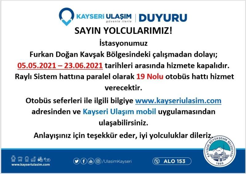 “Furkan Doğan Kavşak Bölgesi’ndeki çalışmadan dolayı, Raylı Sistem T2 Talas Hattı (C. Meydanı-Cemilbaba) 5 Mayıs ile 23 Haziran 2021 tarihleri arasında siz değerli yolcularımıza hizmet veremeyecektir. Bu süre zarfında bu bölgede mağduriyet yaşanmaması için raylı sistem hattına paralel olarak 19 nolu otobüs hattı hizmet verecektir. Anlayışınız için teşekkür eder, iyi yolculuklar dileriz.”