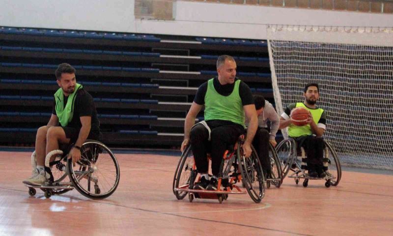 Kayseri’de Erciyes Üniversitesi (ERÜ) Spor Bilimleri Fakültesi öğrencileri, ‘Hayatı Paylaşmak İçin Engel Yok’ etkinliğinde tekerlekli sandalyeye oturarak, bedensel engelli sporcular ile basketbol oynadı.