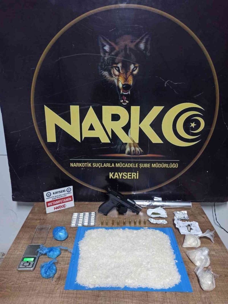 Narkotik Şube Müdürlüğü ekipleri tarafından yapılan çalışmalarda Y.T ve N.K isimli şahısların uyuşturucu madde ticareti yaptığı bilgisi üzerine şahısların adresi tespit edildi. Adreste yapılan aramada paketler halinde satışa hazır 720 gram metamfetamin maddesi, 1.85 gram esrar maddesi, 1 adet uyuşturucu paketlemek için rulo folyo, 1 adet hassas terazi, 9 adet uyuşturucu paketlemek için eldiven, 24 adet Uyuşturucu hap, 1 adet tabanca ve 9 adet fişek bulundu.