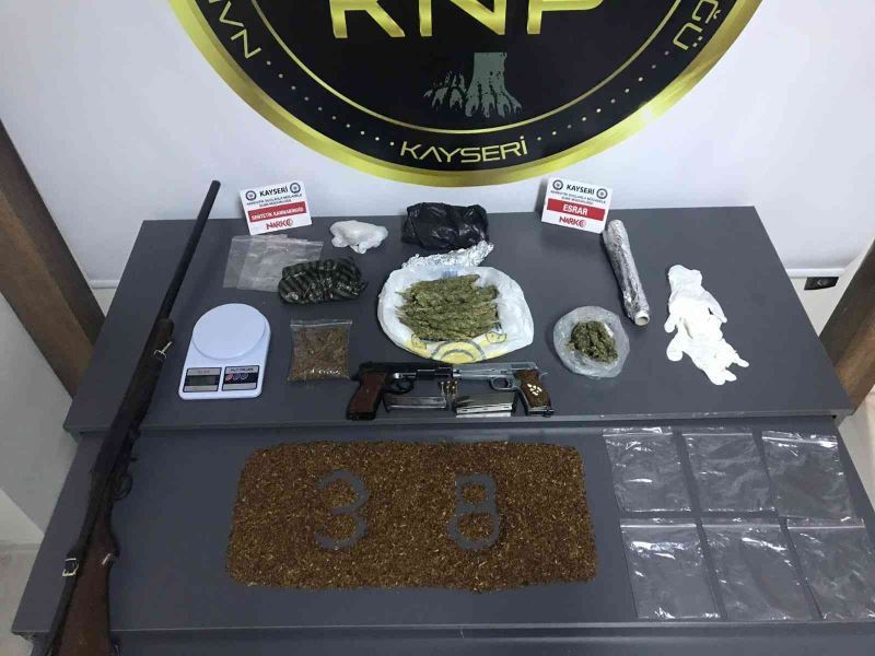 Kayseri İl Emniyet Müdürlüğü Narkotik Suçlarla Mücadele Şube Müdürlüğü ekipleri bir eve operasyon düzenledi. Narkotik köpeği ’Asena’nın da katıldığı aramalarda 600 gram uyuşturucu madde ve çok sayıda ruhsatsız silah ele geçirildi.