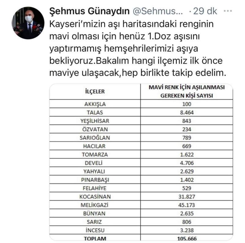 Vali Günaydın; paylaşımında; "Kayseri’mizin aşı haritasındaki renginin mavi olması için henüz 1. doz aşısını yaptırmamış hemşehrilerimizi aşıya bekliyoruz. Bakalım hangi ilçemiz ilk önce maviye ulaşacak, hep birlikte takip edelim" dedi. Günaydın ayrıca ilçelerin mavi renge dönmesi için aşılanması gereken kişi sayısını da paylaştı. Buna göre Kayseri’de toplam 105 666 kişinin aşı olması gerekiyor.