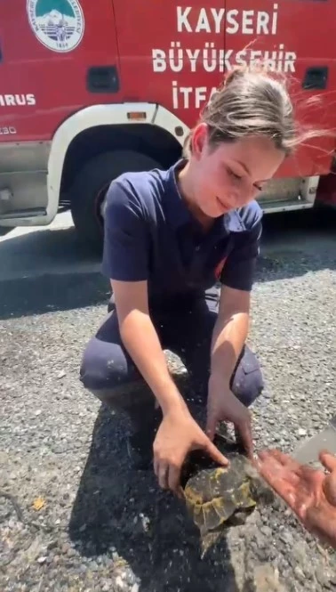 Yangında mahsur kalan kaplumbağaya itfaiyeden yardım eli