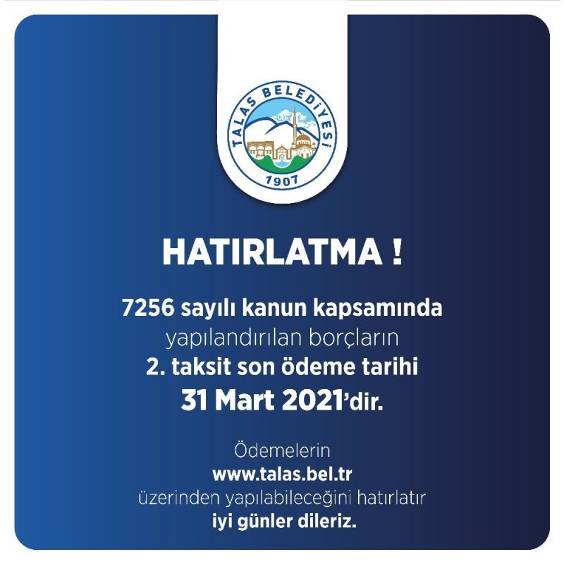Konuyla ilgili bir hatırlatmada bulunan Talas Belediye Başkanı Mustafa Yalçın, belediyeye olan borçlarını yapılandıran vatandaşların, hak kaybı yaşamaması için taksitlerini düzenli olarak ödemesi gerektiğini ifade ederek, “7256 sayılı kanun kapsamında yapılandırılan borçların 2. Taksit ödemeleri 31 Mart Çarşamba günü sona eriyor. Yapılandırmadan yararlanan Talaslı hemşehrilerimizin bu tarihe kadar 2. taksitlerini ödemesi gerektiğini bir kez daha hatırlatıyorum” dedi.