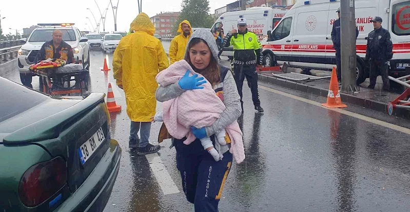 Bu sırada sağlık çalışanı kadın da kazada yaralanan bebeği sağanak yağış nedeniyle ıslanmasın diye kucağına alarak ıslanmaması için çaba sarf etti. Anne şefkati gösteren sağlık çalışanı, bebekle yakından ilgilendi.