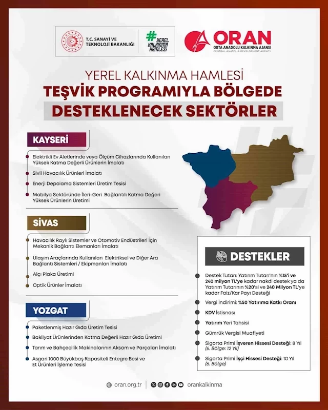 Sanayi ve Teknoloji Bakanlığı tarafından yürürlüğe konan Yerel Kalkınma Hamlesi Programı; Türkiye genelindeki 81 il için özel olarak belirlenen yatırım önceliklerini duyurdu. Programın usul ve esaslarını belirleyen tebliğ, 9 Temmuz 2025 tarihli ve 32566 sayılı Resmî Gazete’de yayımlandı. Program, iller arası gelişmişlik farklarını azaltmak, yerel potansiyelleri ekonomiye kazandırmak ve yüksek katma değerli üretimi teşvik etmek amacıyla hayata geçirildi. Her il için 4 sektörel başlık altında yatırım öncelikleri belirlendi. Kayseri, Sivas ve Yozgat için bu kapsamda illerin sahip olduğu üretim kabiliyetleri, insan kaynağı, altyapı ve potansiyel yatırım alanları dikkate alınarak belirlenen konular şu şekilde açıklandı;