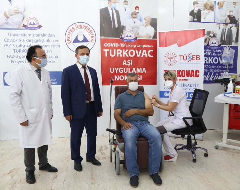 Faz-1 ve faz-2 çalışmaları ERÜ’de yapılan ve Türkiye Sağlık Enstitüleri Başkanlığı (TÜSEB) ile ERÜ iş birliğiyle faz-3 çalışmasına devam edilen yerli korona virüs aşısı TURKOVAC, geliştirildiği üniversite gönüllülere uygulanmaya başlandı. Üniversite çalışanı 45 yaşındaki Mustafa Altuntaş’a yapılan aşıya, ERÜ Rektörü Prof. Dr. Mustafa Çalış da eşlik etti.