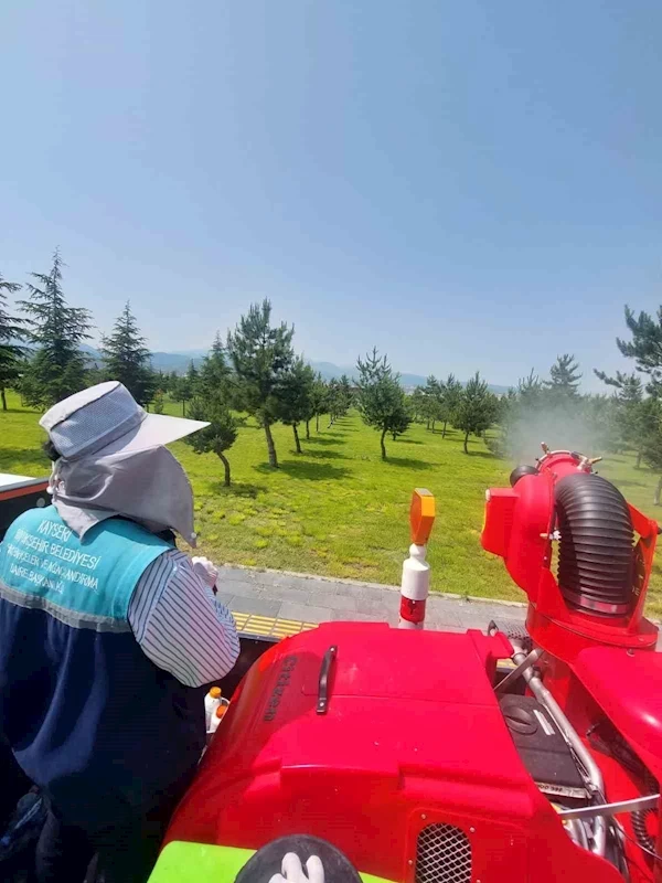 Kayseri Büyükşehir Belediyesi; park, bahçe ve mesire alanı gibi sorumluluk sahasında bulunan tüm yeşil alanlarda hastalık ve zararlılara karşı ilaçlama çalışmalarını titizlikle yürütüyor.