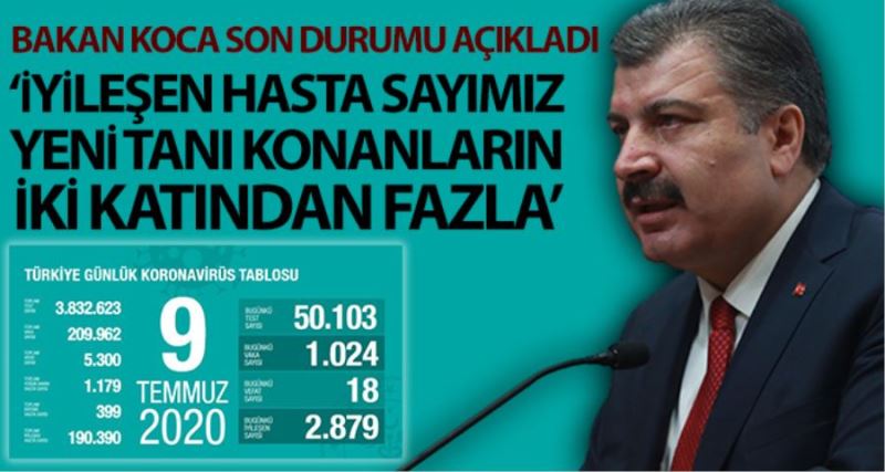 Sağlık Bakanlığından yapılan açıklamaya göre, son 24 saatte 18 kişi korona virüsten hayatını kaybetti, toplam can kaybı ise 5 bin 300'e yükseldi. Bugün toplam 50 bin 103 test yapılırken, bin 24 yeni vaka tanısı konuldu, toplam vaka sayısı ise 209 bin 962 oldu. Bugün 2 bin 879 kişiyle birlikte toplam iyileşen hasta sayısı da 190 bin 390'e yükseldi. Toplam entübe hasta sayısının 399, toplam yoğun bakım hasta sayısının ise bin 179 olduğu açıklandı