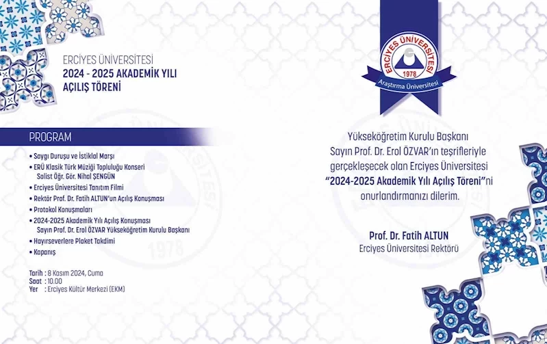 Yükseköğretim Kurulu (YÖK) Başkanı Prof. Dr. Erol Özvar, Erciyes Üniversitesi (ERÜ) 2024-2025 Akademik Yıl Açılış Töreni’ne katılmak üzere Kayseri’ye geliyor.